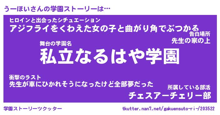 | 男性向けラノベタイトル風あだ名 | 『うーほいの憂鬱』 |