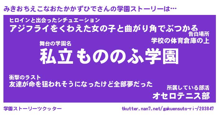 | 女子向けラノベタイトル風あだ名 | 『(仮)みきおちえこなおたかかずひでのやんごとなき事情』 |