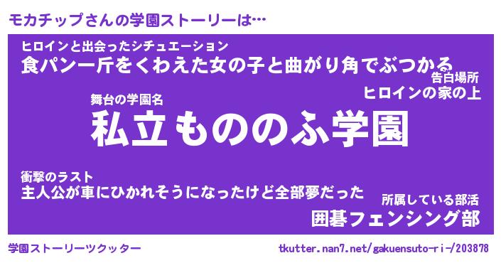 | 女子向けラノベタイトル風あだ名 | 『(仮)モカチップのやんごとなき事情』 |