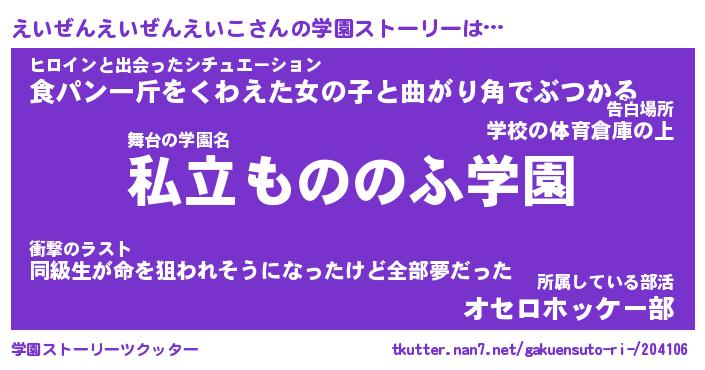| 男性向けラノベタイトル風あだ名 | 『えいぜんえいぜんえいこの憂鬱』 |