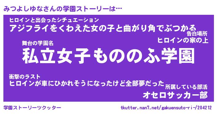| 女子向けラノベタイトル風あだ名 | 『誰かこのみつよしゆなを説明してください! ~契約から始まるウェディング~』 |