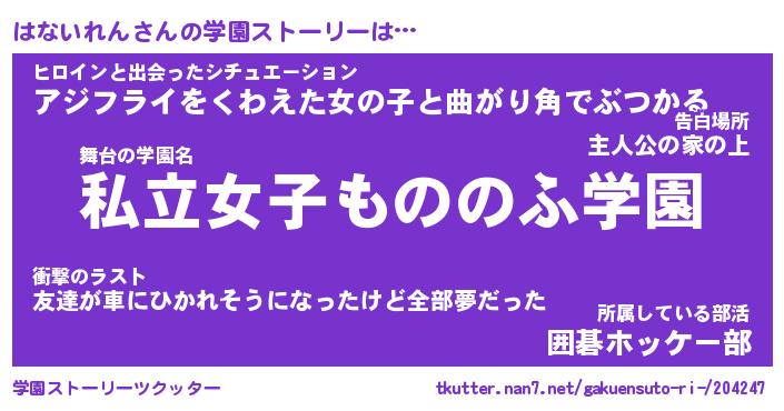 | 男性向けラノベタイトル風あだ名 | 『ハナイレンアートオンライン』 |