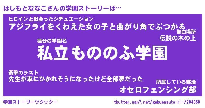 | 男性向けラノベタイトル風あだ名 | 『はしもとななこの憂鬱』 |