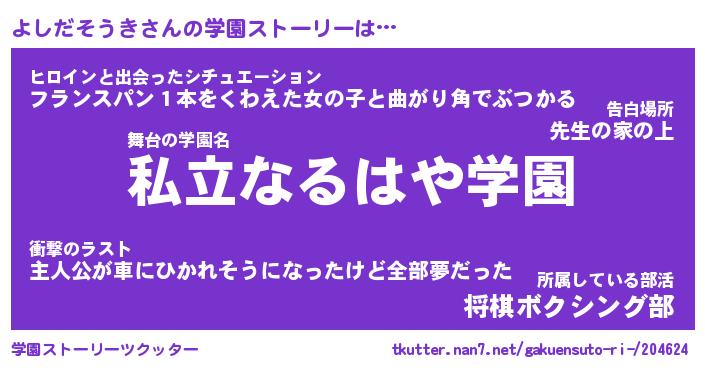 | 男性向けラノベタイトル風あだ名 | 『よしだそうきの憂鬱』 |