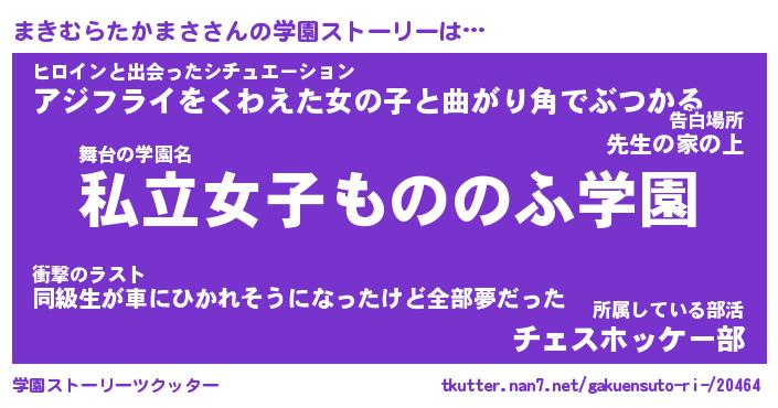 | 女子向けラノベタイトル風あだ名 | 『誰かこのまきむらたかまさを説明してください! ~契約から始まるウェディング~』 |
