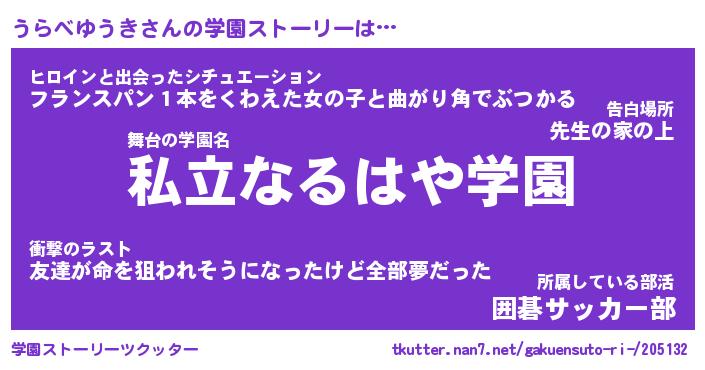 | 女子向けラノベタイトル風あだ名 | 『(仮)うらべゆうきのやんごとなき事情』 |