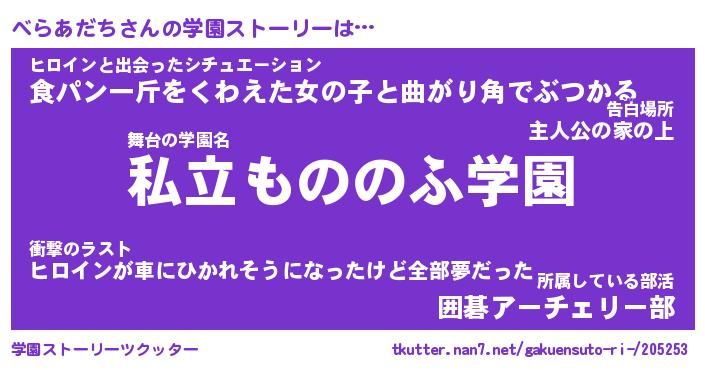 | 男性向けラノベタイトル風あだ名 | 『べらあだちの憂鬱』 |