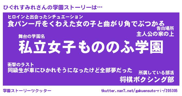 | 女子向けラノベタイトル風あだ名 | 『ひぐれすみれ姫と円卓の騎士』 |