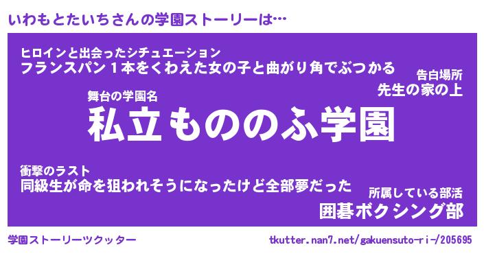 | 男性向けラノベタイトル風あだ名 | 『いわもとたいちの憂鬱』 |