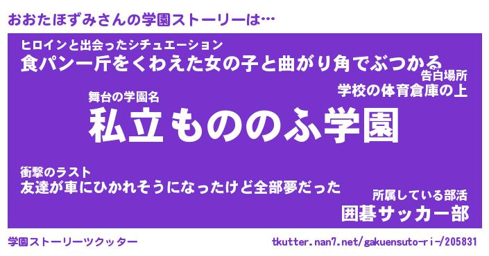 | 男性向けラノベタイトル風あだ名 | 『おおたほずみの憂鬱』 |