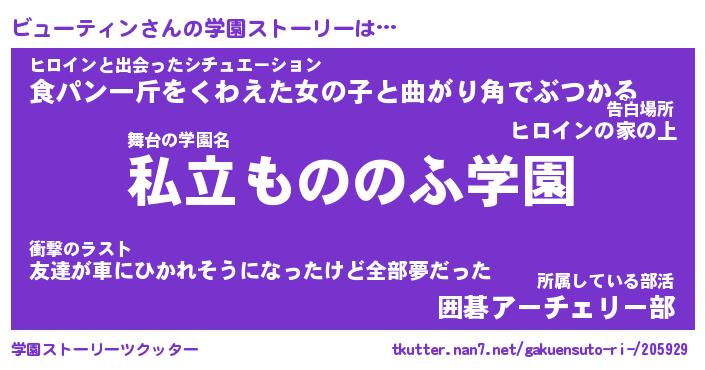| 女子向けラノベタイトル風あだ名 | 『(仮)ビューティンのやんごとなき事情』 |