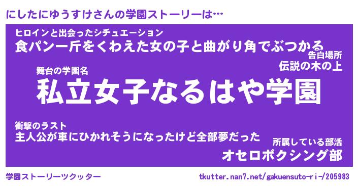 | 女子向けラノベタイトル風あだ名 | 『にしたにゆうすけ姫と円卓の騎士』 |