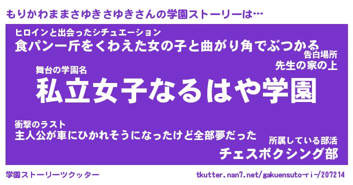 | 女子向けラノベタイトル風あだ名 | 『誰かこのもりかわままさゆきさゆきを説明してください! ~契約から始まるウェディング~』 |