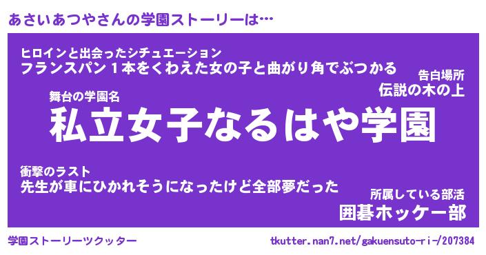 女子向けラノベタイトル風あだ名 | 『誰かこのあさいあつやを説明してください! ~契約から始まるウェディング~』 |