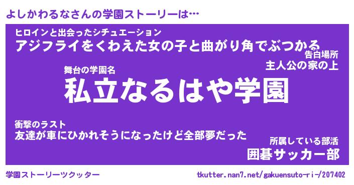 | 伝説のあだ名 | 『伝説のスナイパーよしかわるな』 |