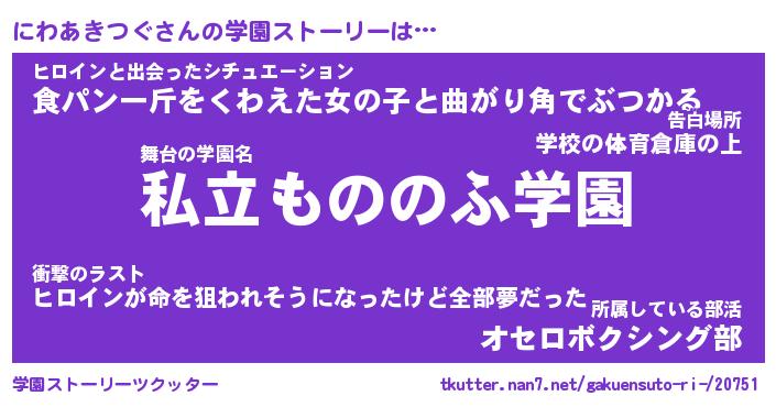 | 男性向けラノベタイトル風あだ名 | 『にわあきつぐの憂鬱』 |