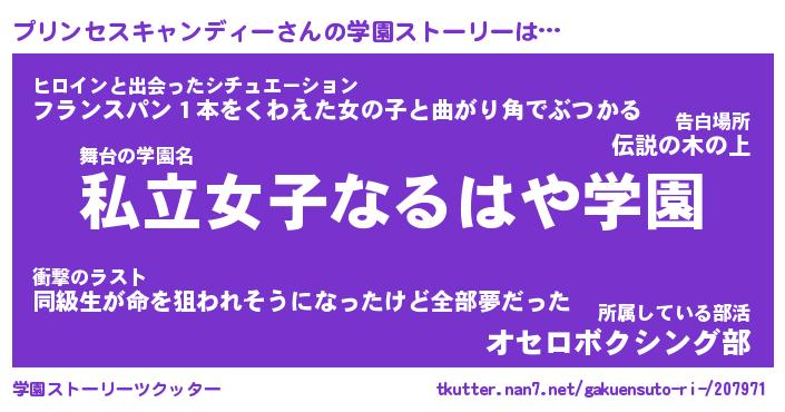 | 女子向けラノベタイトル風あだ名 | 『プリンセスキャンディー姫と円卓の騎士』 |