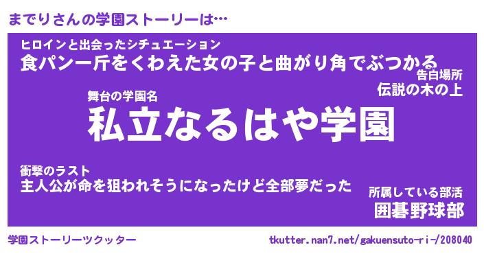 | 男性向けラノベタイトル風あだ名 | 『までりの憂鬱』 |