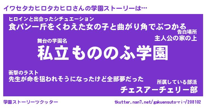 | 男性向けラノベタイトル風あだ名 | 『イワセタカヒロタカヒロの憂鬱』 |