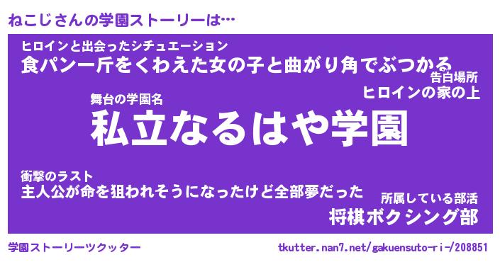 | 男性向けラノベタイトル風あだ名 | 『ねこじの憂鬱』 |