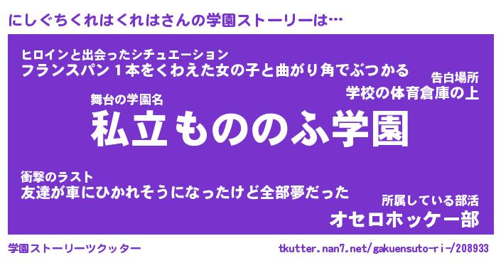 | 女子向けラノベタイトル風あだ名 | 『(仮)にしぐちくれはくれはのやんごとなき事情』 |