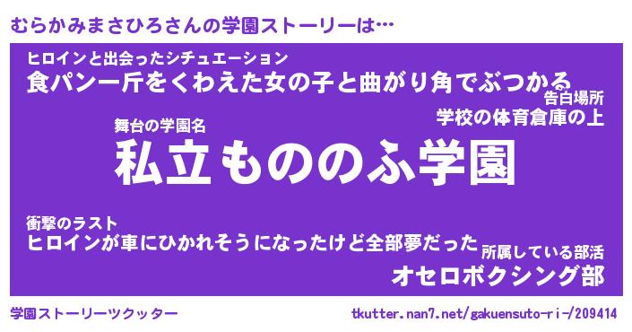 | 男性向けラノベタイトル風あだ名 | 『むらかみまさひろの憂鬱』 |