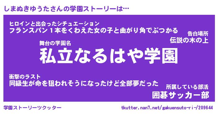 | 伝説のあだ名 | 『伝説のスナイパーしまぬきゆうた』 |