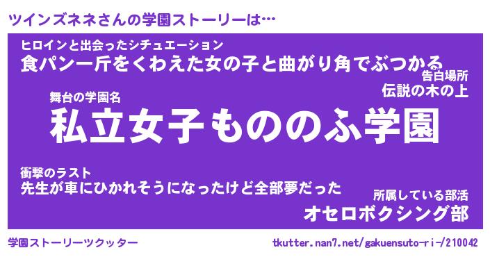| ヒーロー風カッコイイあだ名 | 『スーパーツインズネネ』『天弓騎士ツイ』 |