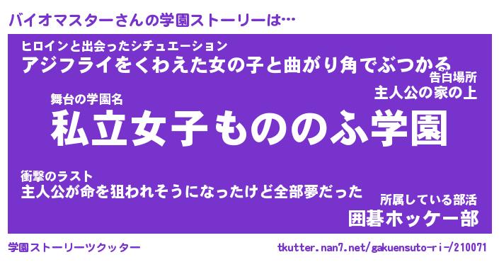 | 男性向けラノベタイトル風あだ名 | 『バイオマスターアートオンライン』 |