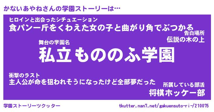 | 男性向けラノベタイトル風あだ名 | 『かないあやねの憂鬱』 |
