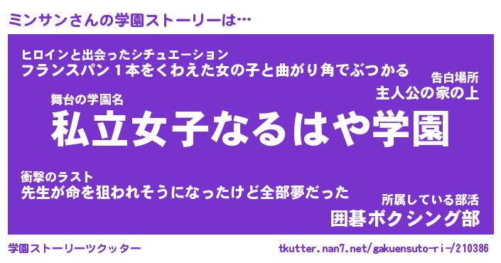 | 女子向けラノベタイトル風あだ名 | 『ミンサン姫と円卓の騎士』 |
