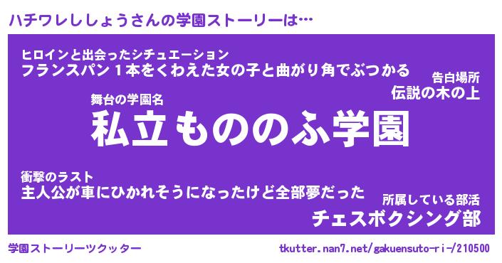 | 女子向けラノベタイトル風あだ名 | 『ハチワレししょう姫と円卓の騎士』 |