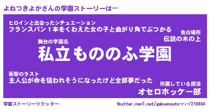 | 男性向けラノベタイトル風あだ名 | 『よねつきよかの憂鬱』 |