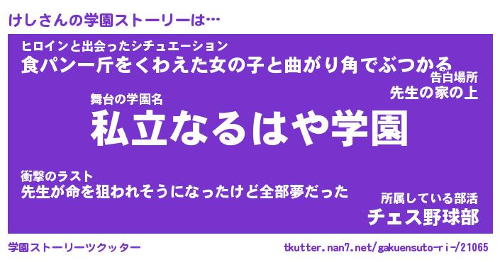 | 男性向けラノベタイトル風あだ名 | 『けしの憂鬱』『ノーゲーム・ノーケシ』 |