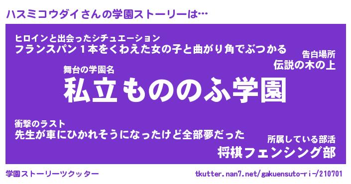 | 男性向けラノベタイトル風あだ名 | 『ハスミコウダイの憂鬱』 |