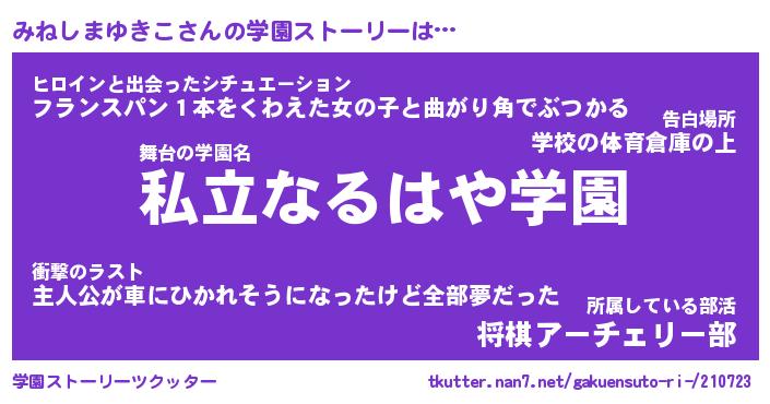 | 女子向けラノベタイトル風あだ名 | 『(仮)みねしまゆきこのやんごとなき事情』 |