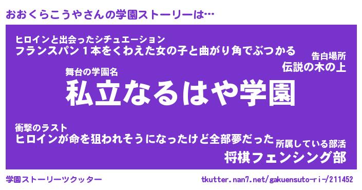 | 男性向けラノベタイトル風あだ名 | 『おおくらこうやの憂鬱』 |