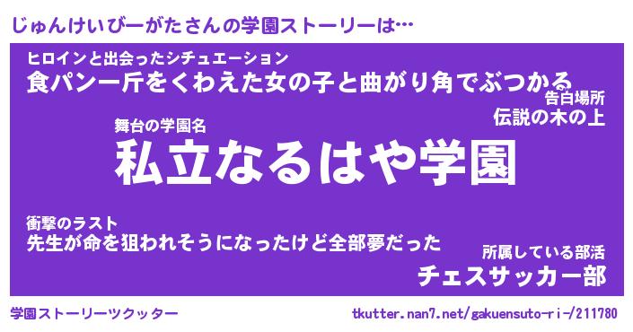| 女子向けラノベタイトル風あだ名 | 『(仮)じゅんけいびーがたのやんごとなき事情』 |