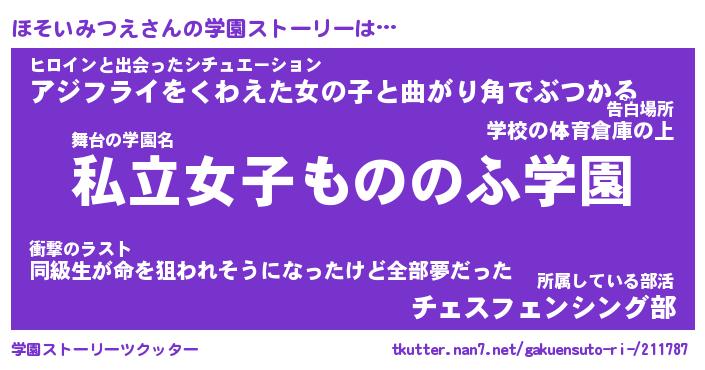 | 女子向けラノベタイトル風あだ名 | 『ほそいみつえ姫と円卓の騎士』 |