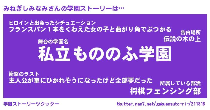| 男性向けラノベタイトル風あだ名 | 『みねぎしみなみの憂鬱』 |