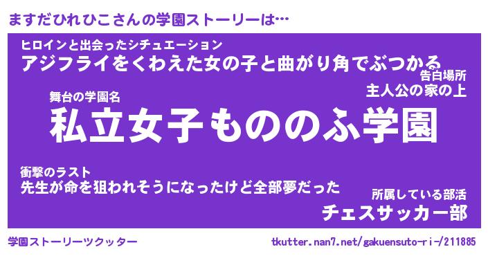 | 女子向けラノベタイトル風あだ名 | 『誰かこのますだひれひこを説明してください! ~契約から始まるウェディング~』 |