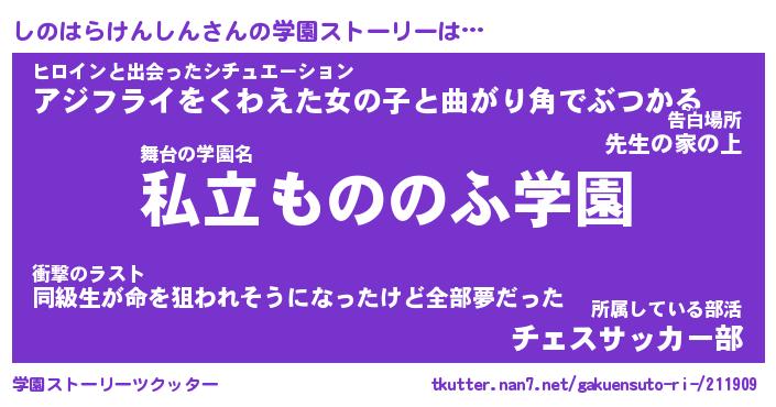 | 女子向けラノベタイトル風あだ名 | 『しのはらけんしん姫と円卓の騎士』 |