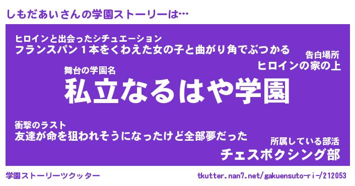 | 女子向けラノベタイトル風あだ名 | 『しもだあい姫と円卓の騎士』 |