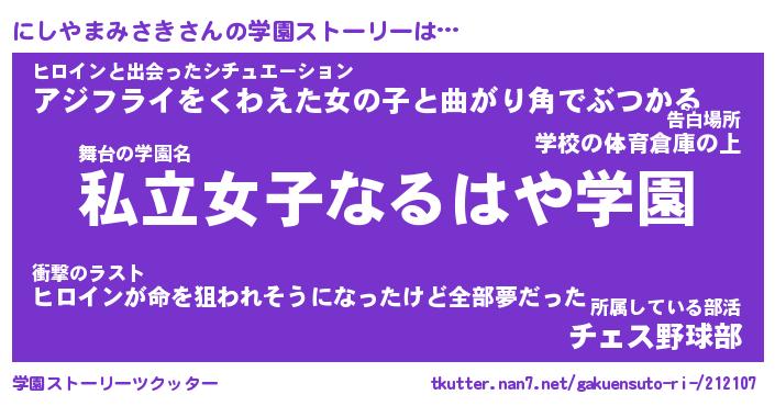 | 女子向けラノベタイトル風あだ名 | 『誰かこのにしやまみさきを説明してください! ~契約から始まるウェディング~』 |