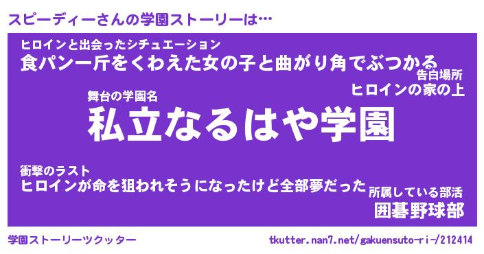 | ヒーロー風カッコイイあだ名 | 『スーパースピーディー』『天弓騎士スピ』 |