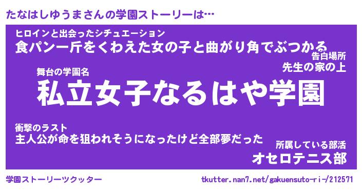 | 女子向けラノベタイトル風あだ名 | 『たなはしゆうま姫と円卓の騎士』 |