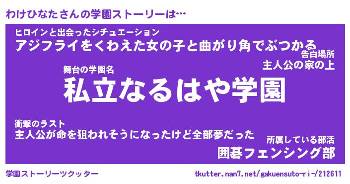 | 女子向けラノベタイトル風あだ名 | 『わけひなた姫と円卓の騎士』 |