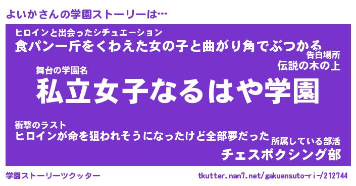 | 女子向けラノベタイトル風あだ名 | 『よいか姫と円卓の騎士』 |