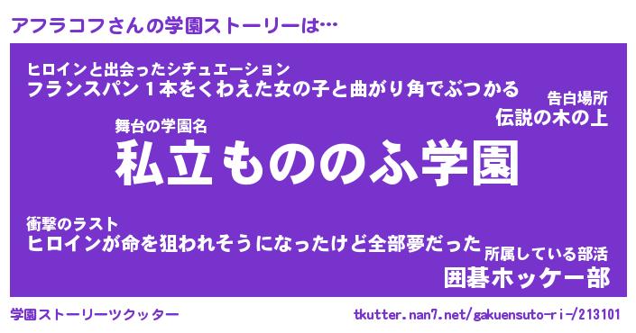 | 男性向けラノベタイトル風あだ名 | 『アフラコフの憂鬱』 |