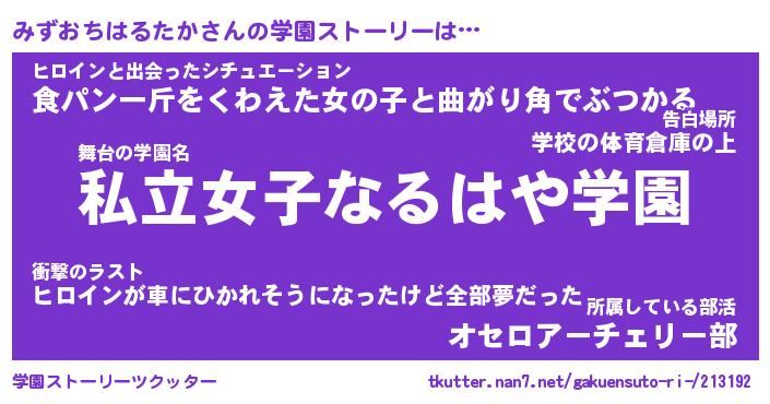 | 伝説のあだ名 | 『封印されしスナイパーみずおちはるたか』 |